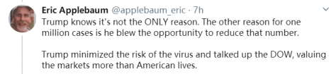 “特朗普清楚这不是唯一的原因。美国感染病例超过100万例的另一个原因,是他错失了减少这一数字的时机。特朗普‘最小化’新冠病毒的风险,并大肆宣扬道指,对市场的重视程度远超对美国人生命(的重视程度)。”