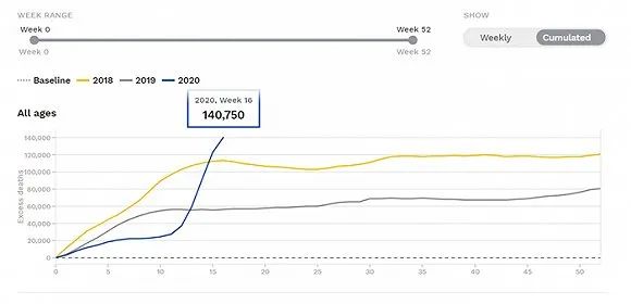 EuroMOMO的统计将24个国家从2009年到2019年的平均死亡人数作为基准线。比较显示,今年第16周,也就是4月13日起算的七天,超额死亡已经超过14万,为2018年以来最高。从3月16日到4月12日,有约7万超额死亡。