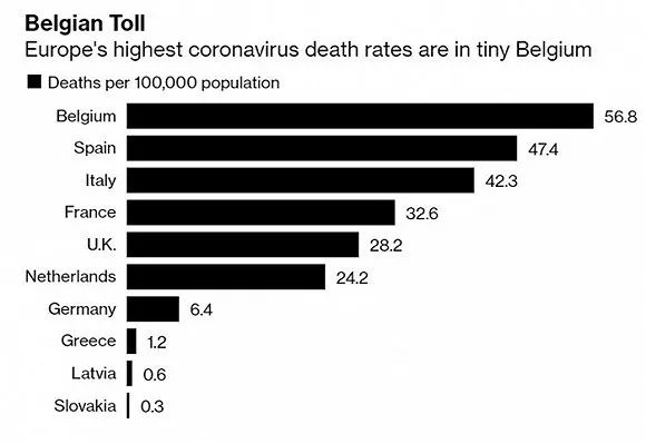 彭博社统计显示,截至24日,比利时每10万人中有高达56.8例新冠死亡病例,是美国的近四倍,为各国最高。在欧洲死亡人数最多的意大利,这一数字为42.3;西班牙为47.4。