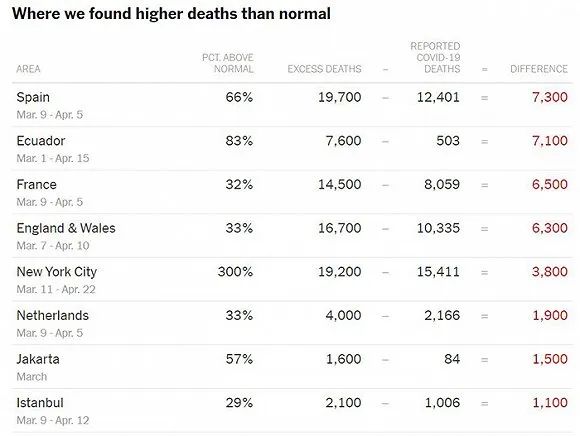 《纽约时报》采用类似的方法,对西班牙等12个国家和城市的死亡人数统计对比发现,3月,各地全因超额死亡与官方公布的新冠死亡人数之间至少相差3.6万人。