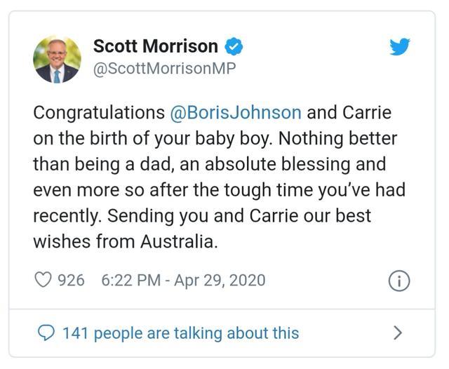 澳大利亚总理莫里森也送上了祝福