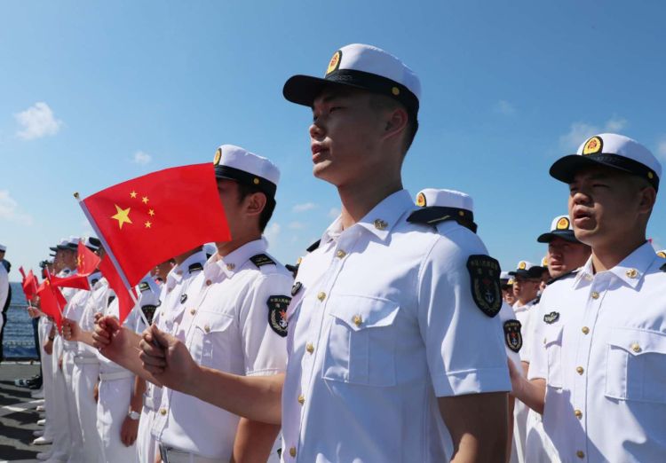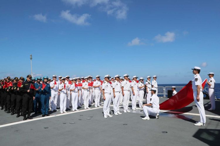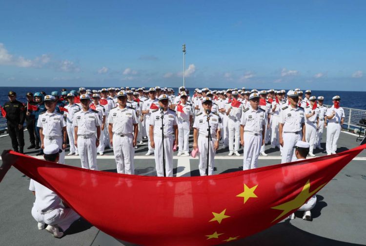 “不忘初心,牢记使命;英勇顽强,连续作战!”上午10时,南中国海晴空万里,编队官兵精神抖擞,整齐列队,伴随着导弹驱逐舰西宁舰汽笛长鸣,仪式正式开始,《中华人民共和国国歌》在大洋上奏响,鲜艳的五星红旗迎风飘扬,编队指挥员进行致辞,全体官兵高声唱起《歌唱祖国》,以昂扬的斗志和饱满的精神状态向祖国和人民致敬。