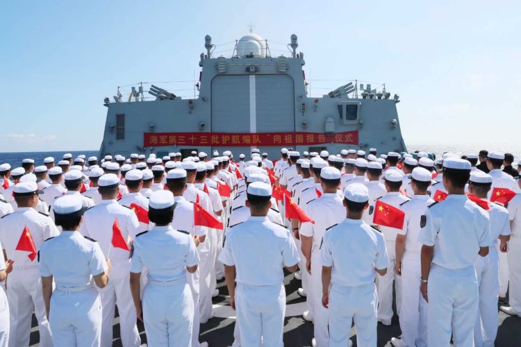 3月13日上午,海军第三十三批护航编队在穿越传统疆域线回归祖国怀抱之际,组织开展 “向祖国报告”仪式,表达编队官兵对党的忠诚、对祖国的热爱,激发官兵圆满完成任务的信心决心。