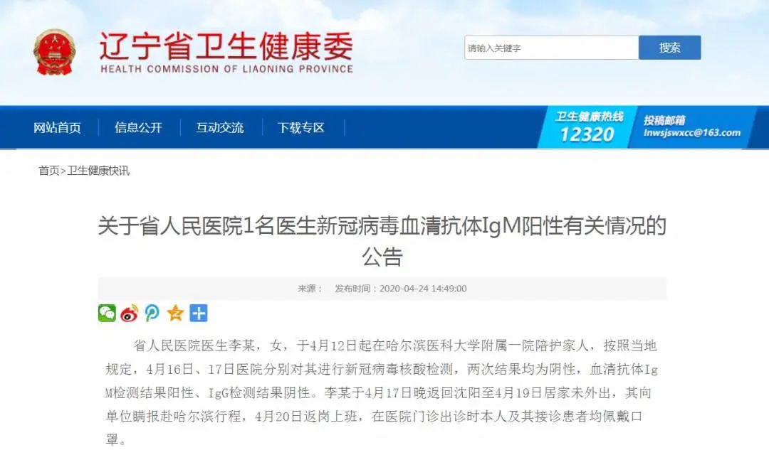 辽宁省卫健委24日发布公告,该省人民医院一名女医生,瞒报去哈尔滨的行程,新冠病毒血清抗体IgM检测结果阳性。