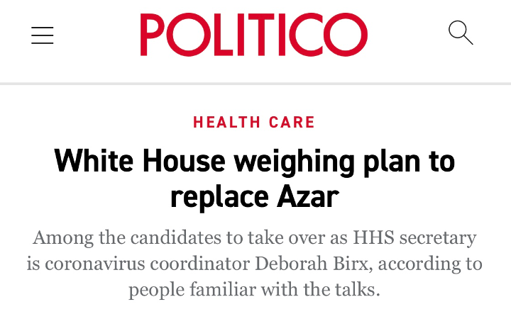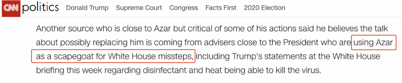 CNN报道称,作为白宫新冠病毒应对工作组的负责人,阿扎在关键问题上缺乏沟通,特朗普私下对此表示失望。阿扎还与美国医疗保险和医疗补助服务中心主管西玛维尔玛意见不合,而西玛维尔玛是彭斯的盟友。