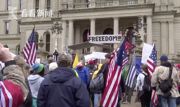 报道称,这一名为“美国爱国者集会”的示威活动是由一个自称“密歇根州自由联盟”的团体组织的。4月15日,密歇根州也曾有数千人举行示威,抗议惠特默延长居家限制令。目前她已将该州的居家限制延长到至少5月15日,但同时也放宽了一些限制,让一些企业可以重新开业,让公众可以参加更多的户外活动。