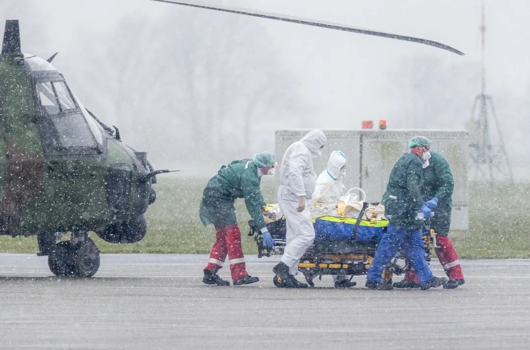 ▎3月29日,德国军用直升机运送了一名法国新冠病人,安排其到德国北威州埃森大学医院收治(Marcel Kusch/dpa)