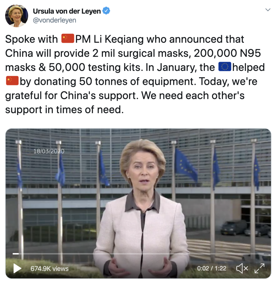 ▎欧盟主席Ursula von der Leyen在推特上发言,称在跟总理李克强通话后达成协议。中国将为欧盟内提供两百万个手术口罩,20万个N95口罩和5万个试剂检测盒