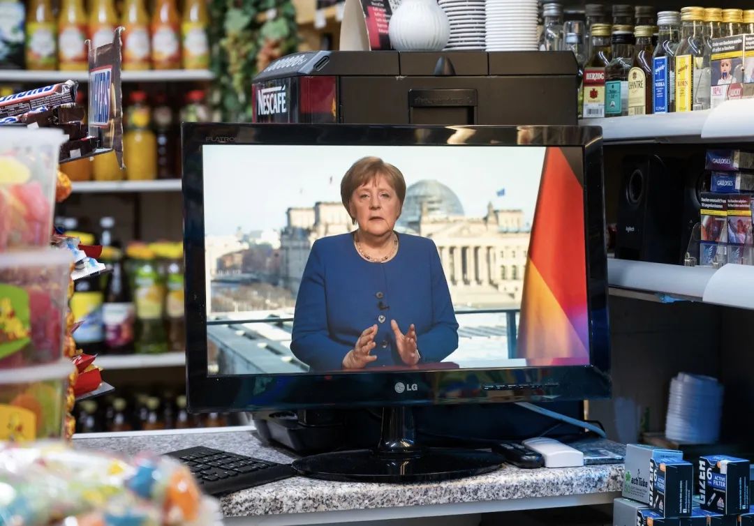 ▎柏林一个商店里的电视在播放总理默克尔致全国民众的电视讲话。Christophe Gateau/dpa