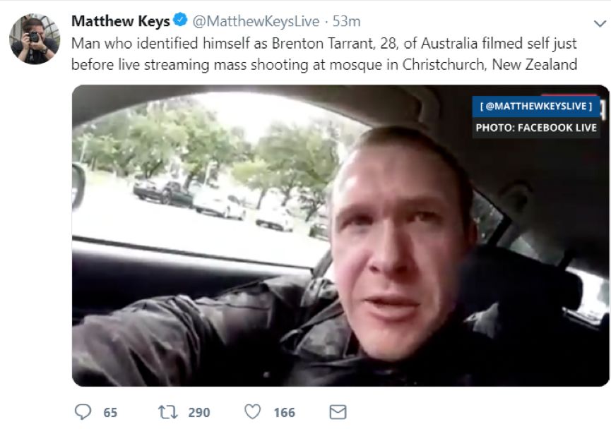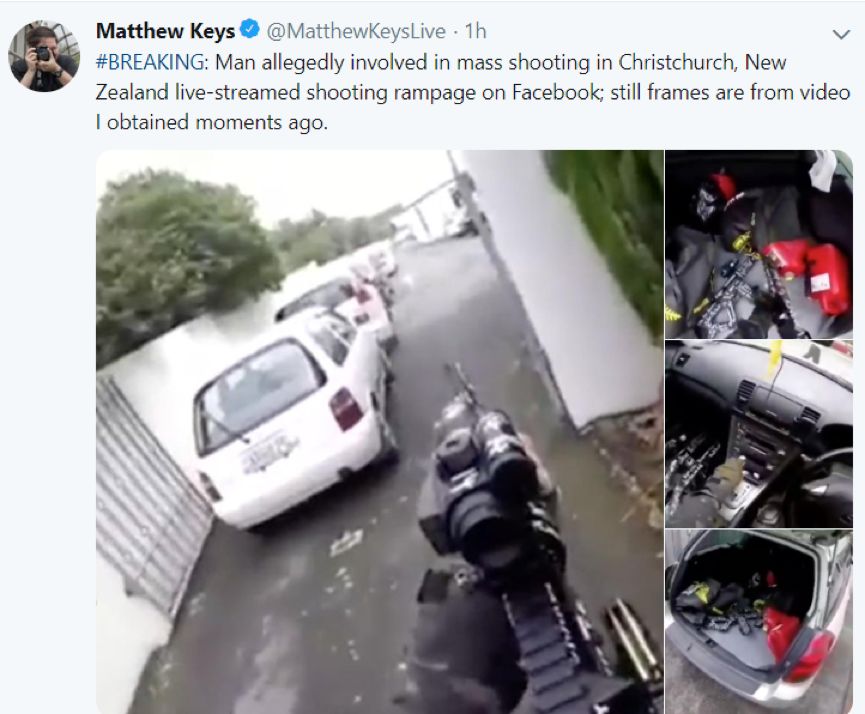 有外媒记者就曝光说,其中一名疑似名为Brenton Tarrant的凶手竟然在自己的个人社交账号上现场直播了自己从出门到开枪杀人的过程: