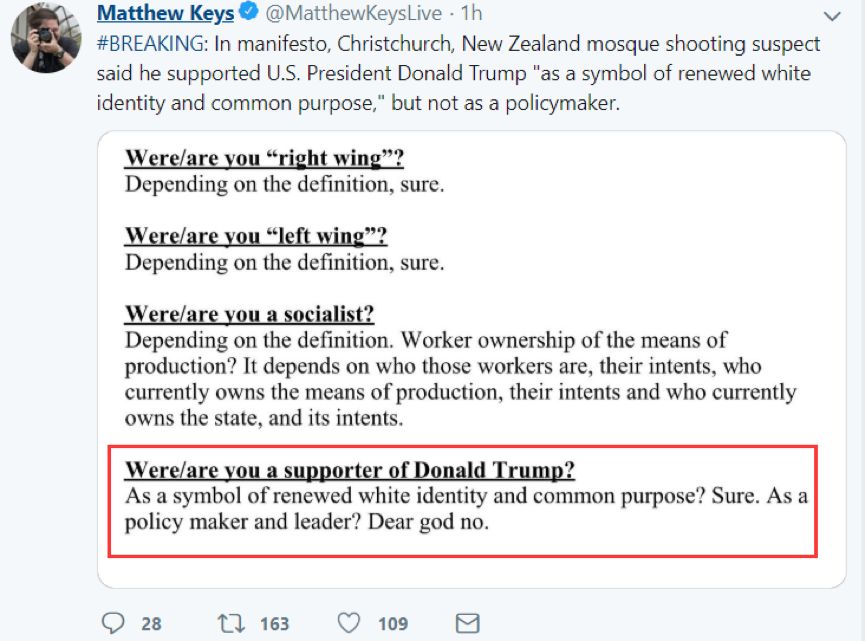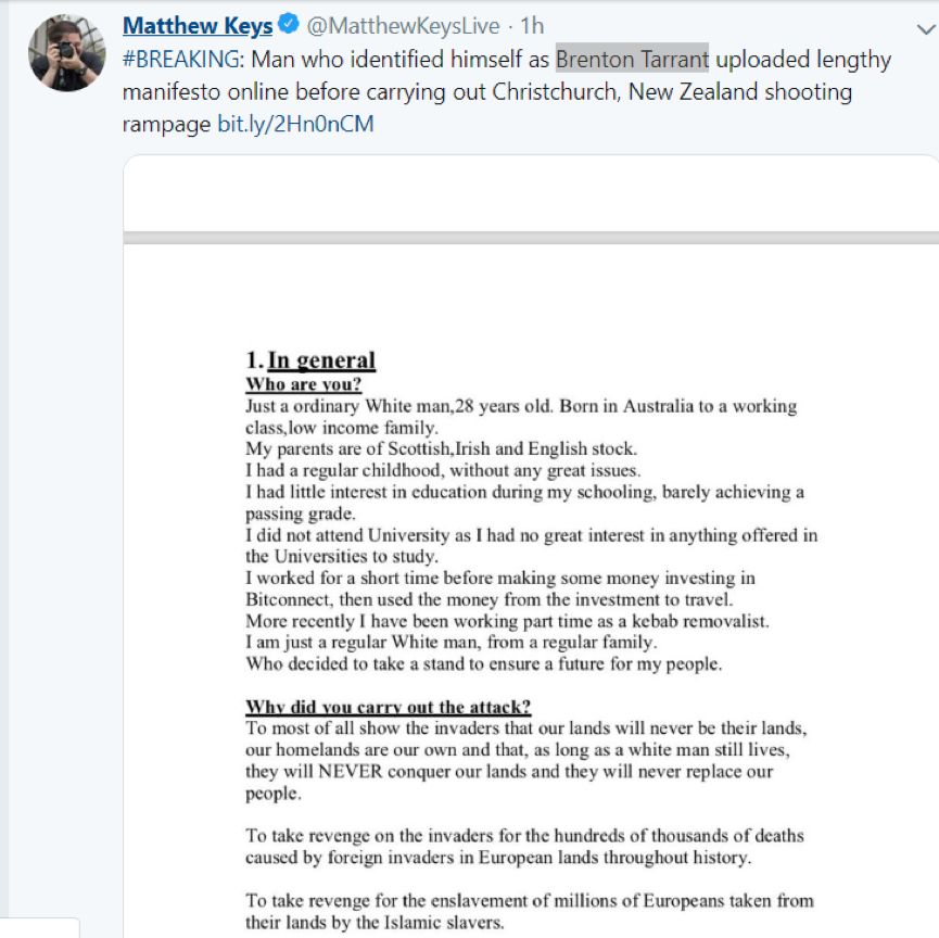 在这份贴文中,他表示自己是一名来自澳大利亚低收入家庭的28岁白人男子,发动这次屠杀则是为了报复“侵略者”——他甚至宣称“只要白人还有一口气,就不会允许自己的家园被征服”。