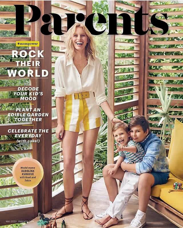 大KK带着儿子们一起登上Parents Magazine 五月封面, 少了超模的凌厉之感, 呈现幸福温馨的状态。