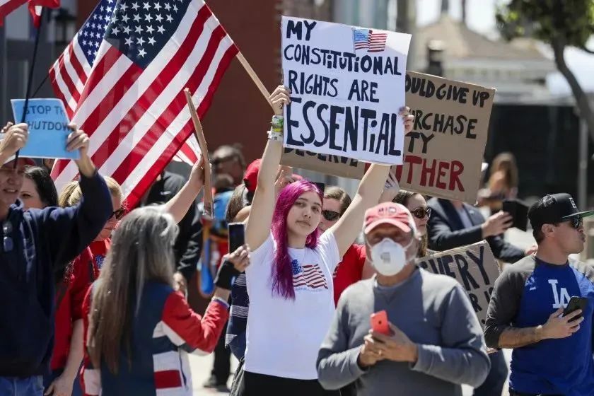 同日,100多名示威者聚集洛杉矶亨廷顿海滩,参加反对居家令的抗议示威活动,抗议加州政府在新冠肺炎疫情期间颁布的居家令。