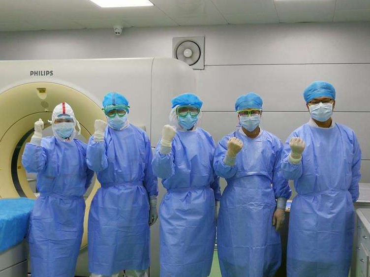 黄向炼是广西壮族自治区南溪山医院放射治疗科的一名技师,在医院工作10年。从大年三十在医院值第一个班开始,黄向炼79天没回过家。图为黄向炼(左三)和同事合影(2月7日摄)。