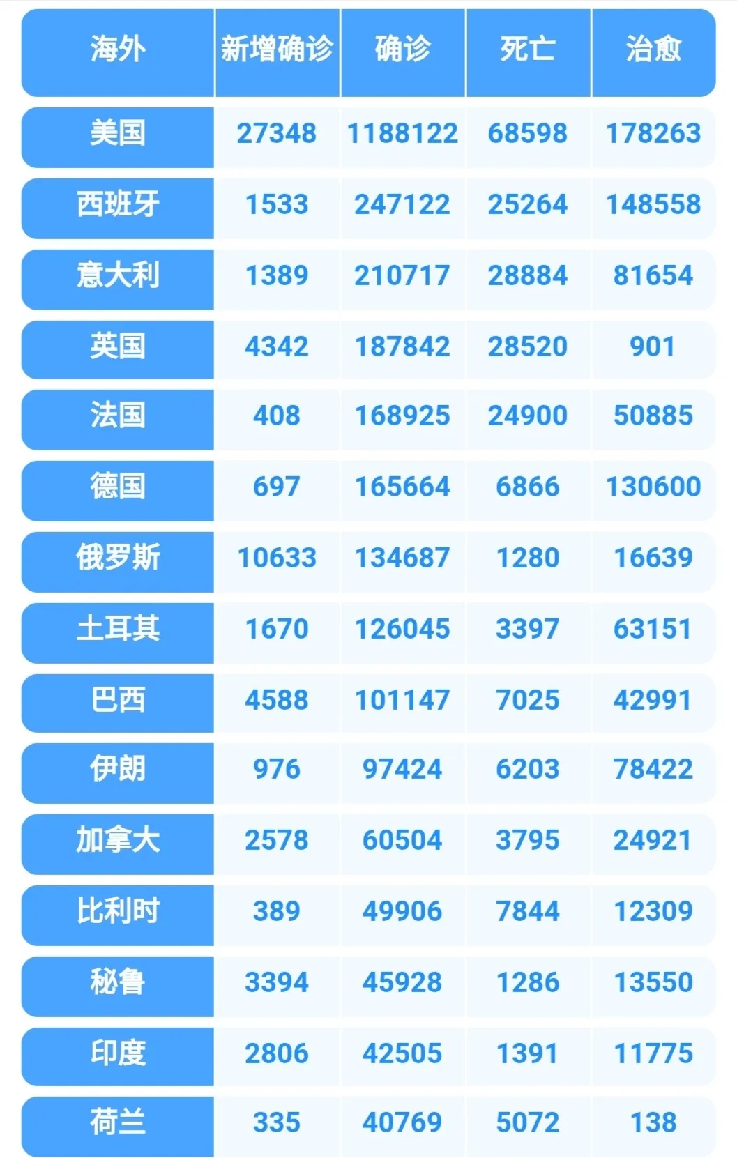 最新海外疫情统计: