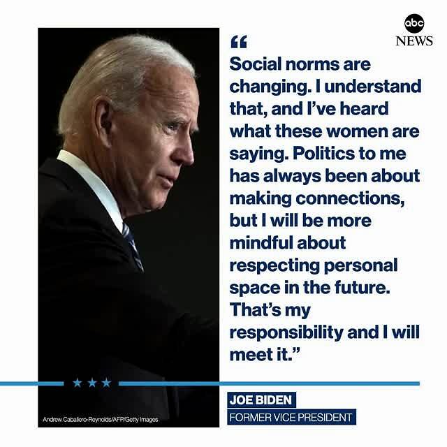 拜登后来回应表示,自己无论对别人拥抱、握手及所做的其他动作,都是为了与别人加强联系,也许这些行为令一些人感到不自在。他说自己意识到,社会规范正在转变,保护私人空间的界线已经被重新设置。他现在听到他人的意见了,以后会加倍注意自己的行为,这是他的责任。