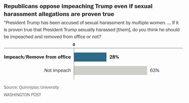 昆尼皮亚克大学在2017年12月发布的一项民调显示,59%的女性和41%的男性认为特朗普应该为不当性行为辞职。但是在共和党内部,性侵指控更是不值一提。民调结果显示,即使证据做实特朗普性侵妇女,63%的共和党人认为特朗普不应该因此遭到弹劾。