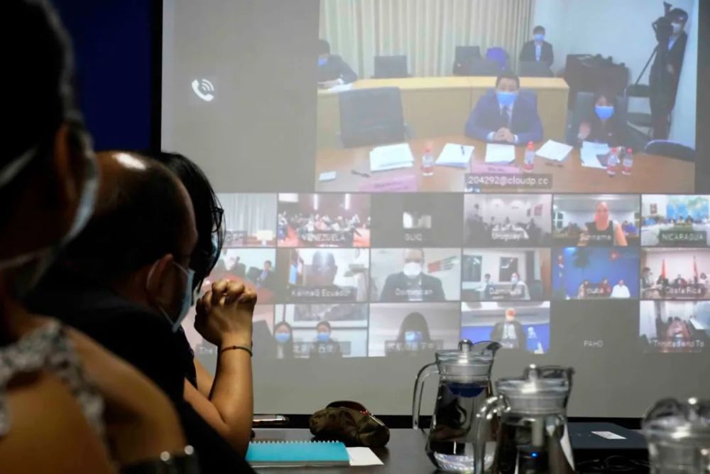 当地时间3月23日,中国同拉美和加勒比国家举行了视频工作会议,就新冠肺炎疫情防控开展交流。这是3月23日晚在萨尔瓦多首都圣萨尔瓦多拍摄的视频工作会议现场。新华社发(亚历山大・培尼亚摄)