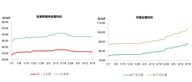 分化的生猪市场2020年前三个月,生猪市场继续高位运行,但不同生猪产品的价格走势出现了明显分化。生猪和猪肉价格高位震荡,仔猪和母猪价格则持续上涨。其中,外三元生猪全国均价从年初的35元/公斤上涨至2月下旬的38元/公斤,之后又稳中回落,截止3月中旬为36元/公斤,相比年初上涨了3%左右。白条猪肉价格走势大体相同。