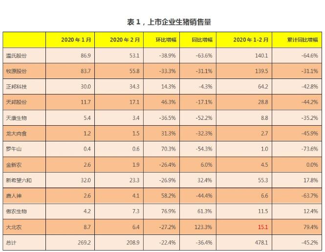 我们预计全年出栏量将在4亿头以下,同比降幅25%以上。从生猪定点屠宰量数据来看,1-2月合计屠宰量为2341万头,同比下降37.2%,创12年来同期最低记录。从企业销售量来看,12家上市企业在今年前两个月的生猪销售量合计478万头,同比下降45%。其中温氏、牧原、正邦、天邦等企业同比降幅分别为-64.6%、-31.1%、-42.8%、-44.2%。企业在解释其下降原因时,除春节假期和疫情影响外,也承认去年以来加大留种力度,投苗减少的因素在起作用。温氏并开始外购仔猪育肥,为企业成立以来首次,反映出市场仔猪资源的稀缺程度。