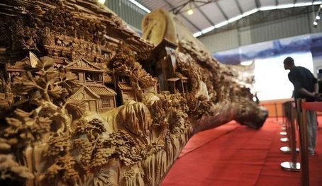 这块巨木的两面,一面雕刻着收藏在北京故宫的宋代版《清明上河图》,另一面雕刻的是收藏在中国台北故宫的清代版《清明上河图》。