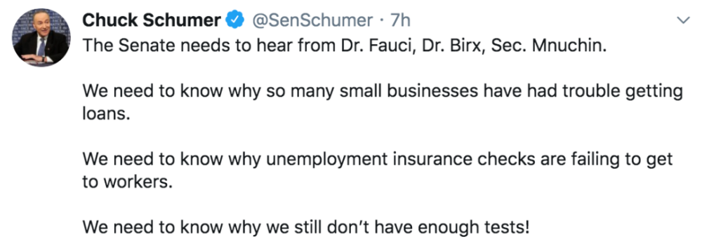 舒默在社交媒体推特上发文称,“参议院需要听一听福奇、比尔克斯和姆努钦的意见”。/ 推特截图