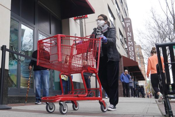近日,在美国弗吉尼亚州阿灵顿,戴口罩的市民准备进入一家超市。新华社
