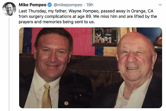 美国国务卿蓬佩奥5月5日在推特上发文称,他的父亲韦恩·蓬佩奥(Wayne Pompeo)4月30日在加州奥兰治(Orange)县因手术并发症逝世,享年89岁。