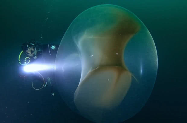 据发现者Ronald Raasch描述,当他在水下16.7米深的地方进行作业时,一颗巨大的“卵囊”从他身边飘过,这颗比成年人还要大的乱囊通体透明,且非常轻盈,Ronald Raasch本人的说法是,这颗巨大的卵囊像极了一颗气球。