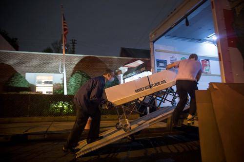 4月29日,在美国纽约昆斯区,殡仪馆工作人员将装有遗体的纸箱搬上车准备运到外地处理。