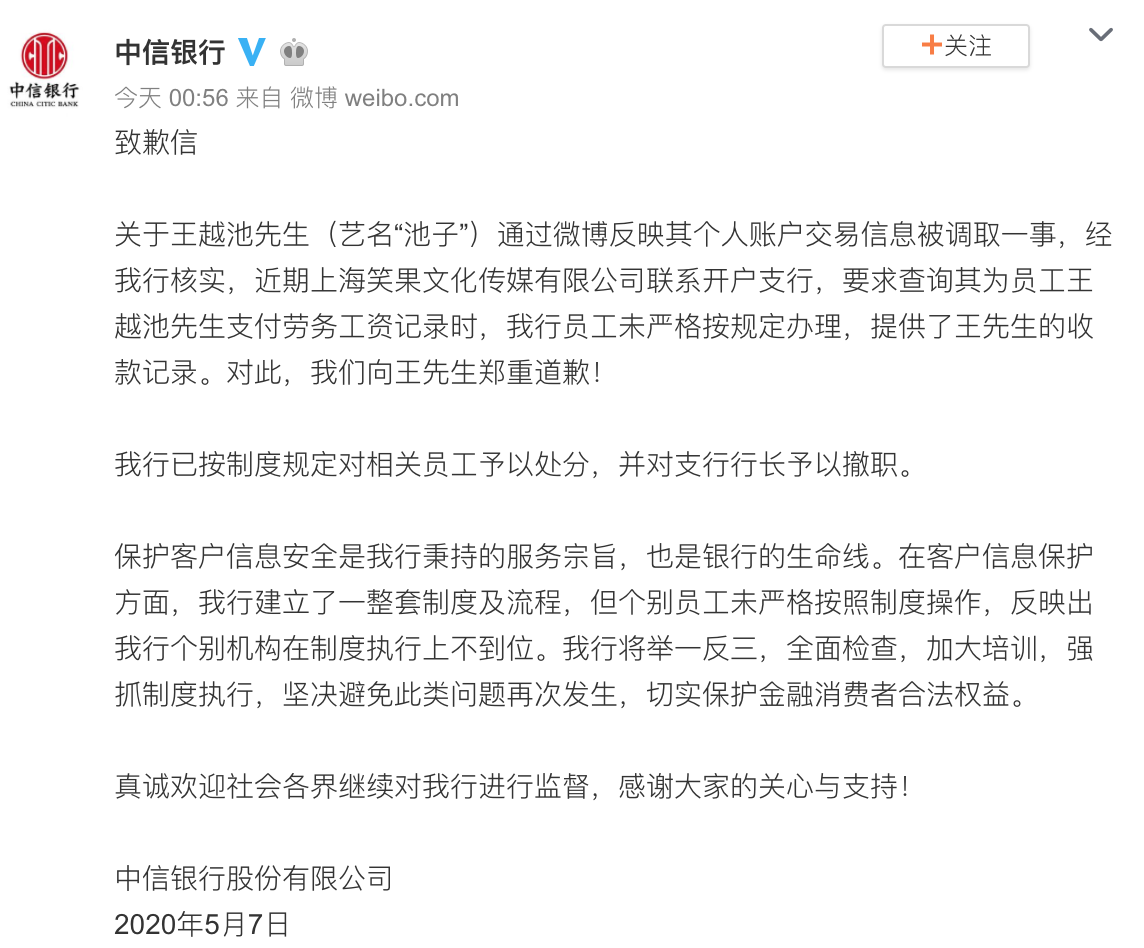 7日凌晨,中信银行回应关于王越池先生通过微博反映其个人账户交易信息被调取一事。中信银行称,经我行核实,近期上海笑果文化传媒有限公司联系开户支行,要求查询其为员工王越池先生支付劳务工资记录时,我行员工未严格按规定办理,提供了王先生的收款记录。对此,我们向王先生郑重道歉!我行已按制度规定对相关员工予以处分,并对支行行长予以撤职。