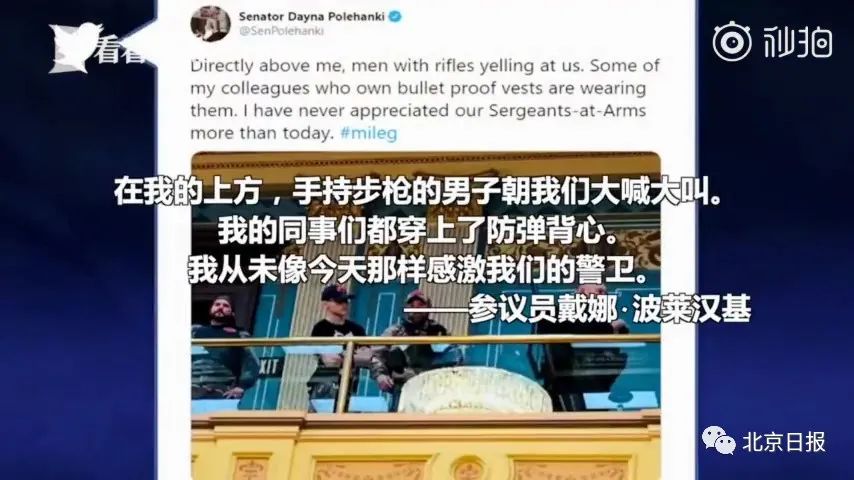 据法新社报道,民主党籍参议员波列汉基(Dayna Polehanki)在推特上上传现场照片,照片中4名男子中至少1人携带武器。波列汉基发文说:“就在我头顶上,拿着来福枪的男子朝我们吼叫。”