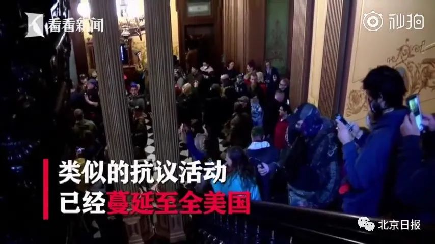这些示威者挥舞着枪支、标语和美国国旗,高呼“让我们进去!”不过,这些示威者遭到议会警卫的拦截和控制,未能进入立法会议厅。