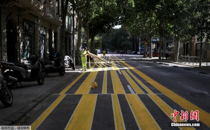 当地时间5月4日起,西班牙绝大部分地区进入分阶段降级封禁措施的准备阶段,部分小商铺重新开业。图为巴塞罗那街道上,工人们扩展人行道面积,以便利行人保持社交距离。