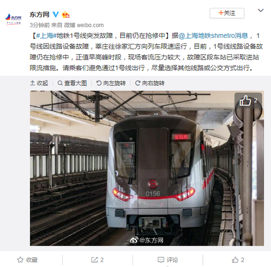 原标题:上海地铁1号线突发故障,目前仍在抢修中