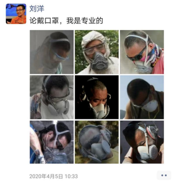 之后,尼泊尔几次延长封城时间,“我心想反正也这样了,得找点事干了,”刘洋开始整理旧照。4月5日,他在朋友圈里发了个“九宫格”图,展示过去的工作照,并配文,“论戴口罩,我是专业的”。