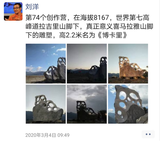 当时刘洋以为国外相对安全,正好可以完成接下来的工作再回国。2月14日,刘洋完成了在印度的雕塑后赶往尼泊尔。此时的尼泊尔航空对中国公民有了严格的要求,必须要离开中国国境30天以上才可入境,恰好刘洋符合。刘洋在尼泊尔制作雕塑的地方海拔2000多米,位于喜马拉雅山脉中段,海拔8167米的世界第七高峰道拉吉里峰脚下。刘洋用两周时间创作出了一座五六吨重、2.2米高的石质雕像,取名《博卡里》,在尼泊尔语里的意思是“湖”。