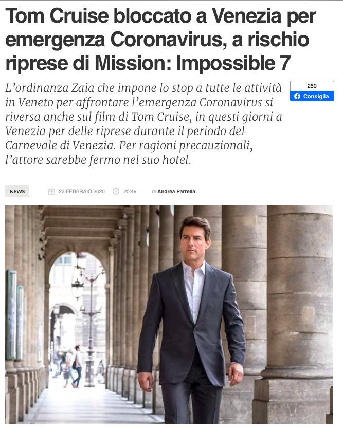 据意大利媒体消息,本计划在威尼斯狂欢节期间进行取景拍摄的《碟中谍7》,因意大利新冠疫情的爆发,以及威尼斯地区大量公共地点的关闭和公开活动的取消,而暂时停止拍摄,包括主演汤姆·克鲁斯在内的演员、工作人员都需待在酒店。随后,派拉蒙影业确认了这一消息,并发布声明表示:“在这段时间内,我们希望顾全剧组的担忧,允许他们回到家中,直到拍摄开始再回归。我们也会持续关注当下形势,与卫生官员和政府官员通力合作。”