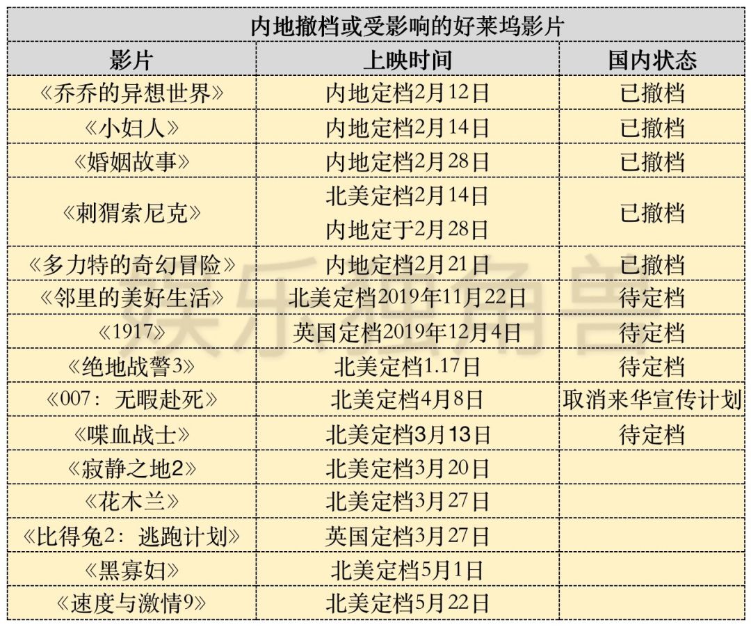 此外,包括北美定档3月13日的《喋血战士》,英国定档3月27日的索尼真人CG动画片《比得兔2:逃跑计划》,北美定档5月1日并由斯嘉丽·约翰逊等人主演的《黑寡妇》,以及北美定档5月22日的《速度与激情9》等影片,或都将受疫情影响,而无法同步引进。缺少或“减仓”中国内地以及日韩等整个亚洲市场的同步票房加持,即使之后能晚于北美市场上映,诸多影片的市场表现也必将大打折扣。