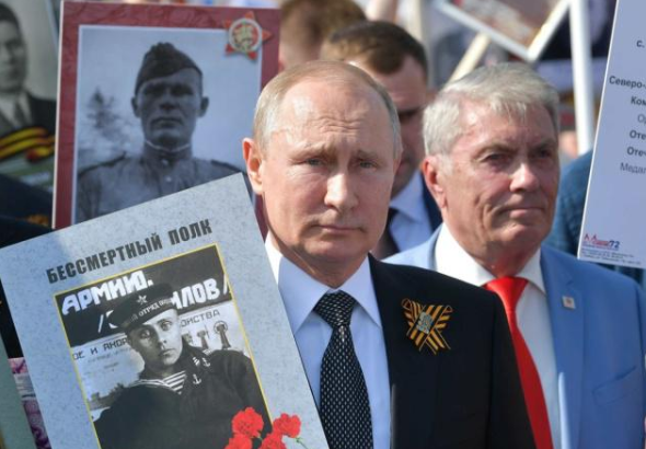 △2019年5月9日,普京手举其父亲照片参加大游行