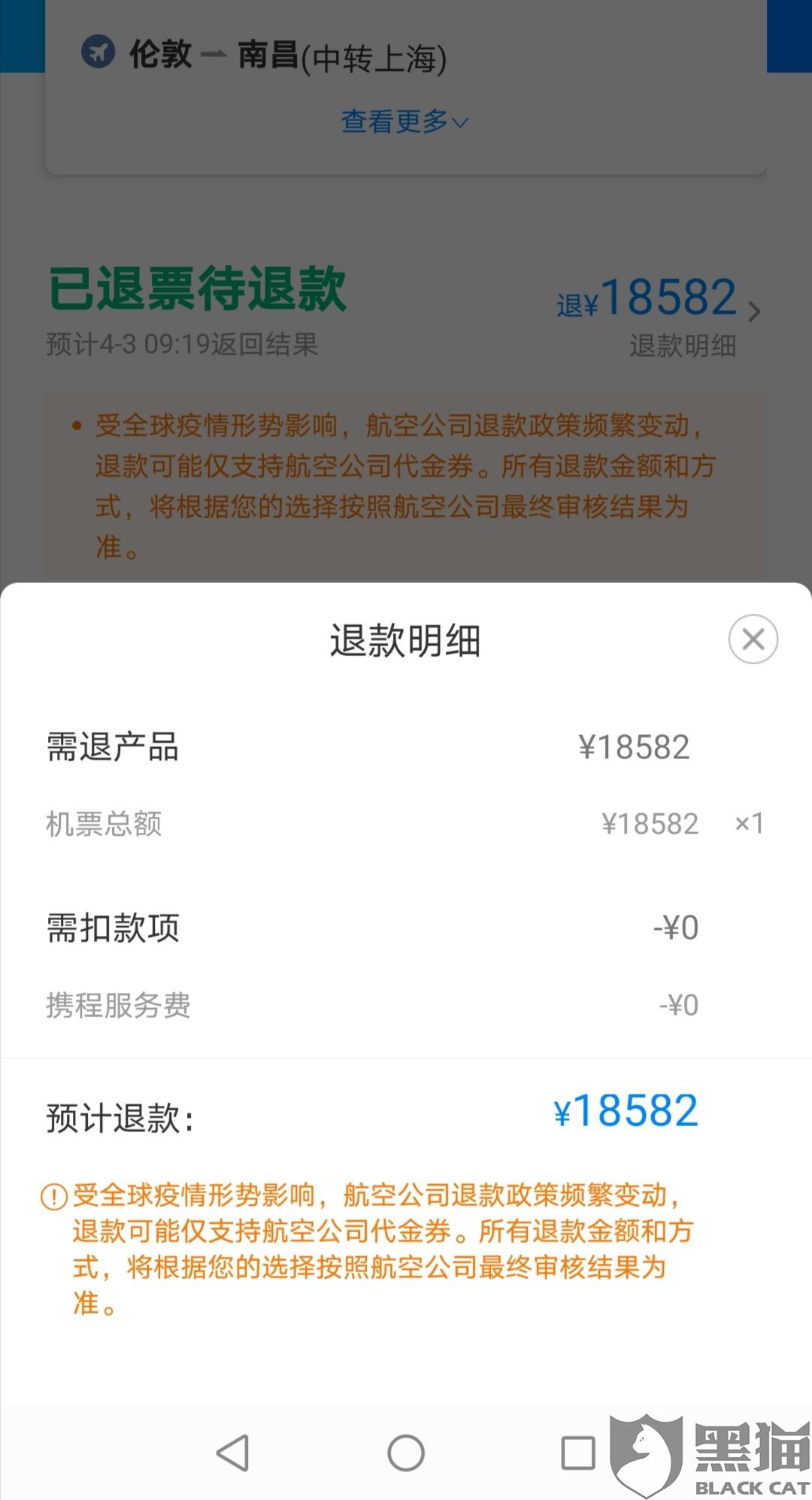 消费者“匿名”在5月1日向黑猫投诉平台反映:“三月份在携程上购买了由伦敦飞往南昌经上海转机的机票,3.14申请退款,显示4.3返回结果,现在距离申请退款时间过去一个半月依旧未退钱,向携程客服反应,催促退款进度,没给我任何有效反馈。并且此航班在我申请退款后也取消了航班,我不知道为什么我后买的一张同样被取消航班的机票退款成功了,这张却迟迟不退款。麻烦尽快进行全额退款。”