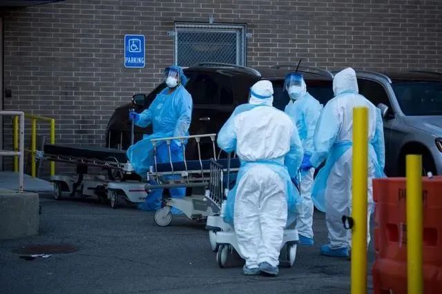 4月6日,在美国纽约一家医院外,医护人员将死亡患者遗体送往临时冷藏车后推着空床返回。新华社发