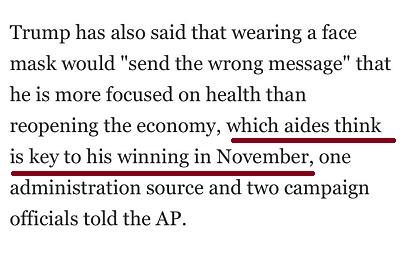 特朗普的工作人员认为,戴口罩会传递一个他本人更关注健康而非经济的错误信息,而助手们经济才是他在11月能否在竞选中胜出的关键。