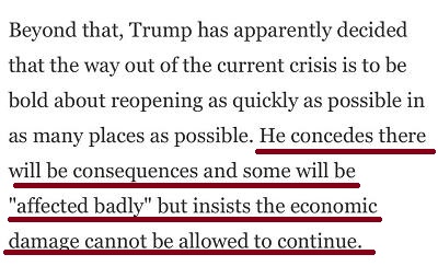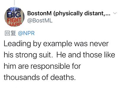 他承认复工会有后果,一些人会受到严重影响,但他坚持认为,不能让经济损失继续下去。他认为不戴口罩能让美国人对经济充满信心。