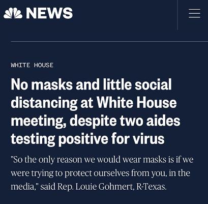 美国全国广播公司(NBC)报道称,尽管已有工作人员新冠病毒检测呈阳性,但白宫开会时,参会人员仍未佩戴口罩以及保持较小的社交距离。