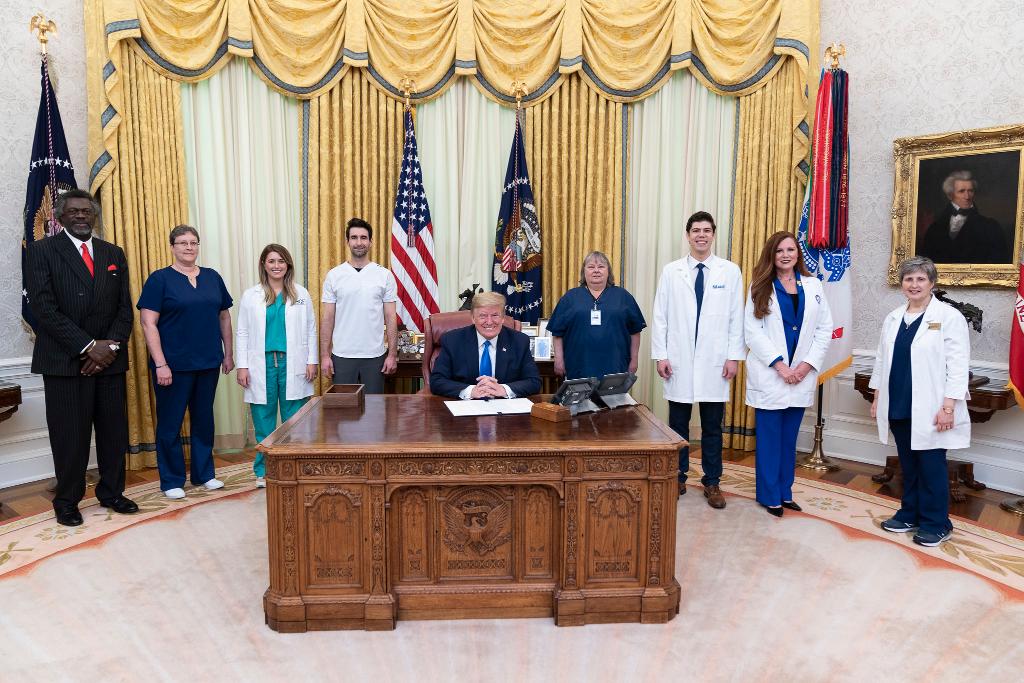 △5月6日,特朗普在白宫与医护人员合影
