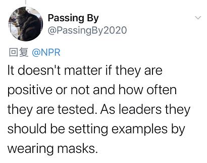 △NPR的报道认为一个戴口罩的总统无论出于什么原因都不好看,而一个被困在白宫的总统也不会表现出自信