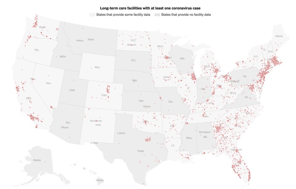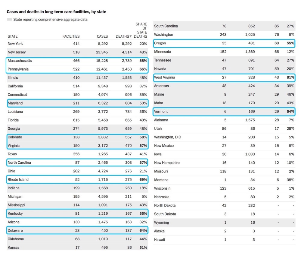 5月9日,《纽约时报》在一篇报道中发布了美国养老机构中确诊及死亡病例的数据,该数据根据各州、县和养老机构发布的官方数字统计而来。数据显示,到目前为止,全美各养老机构已有超143000人感染了新冠肺炎,至少有25600人死亡。