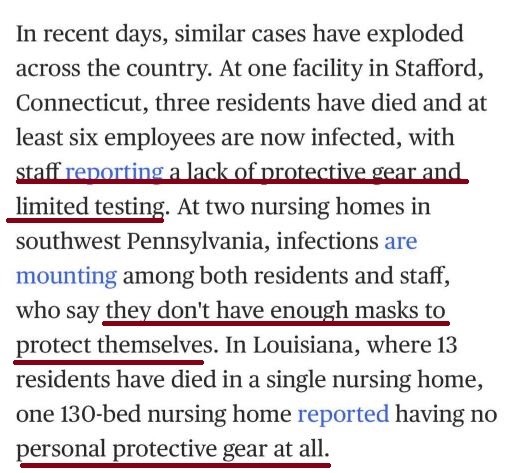 美国全国广播公司(NBC)报道,康涅狄格州斯塔福德的一处机构医疗物资缺失,造成3名老人死亡,至少6名员工感染。在路易斯安那州,一家机构13人去世,这里根本就没有个人防护装备……