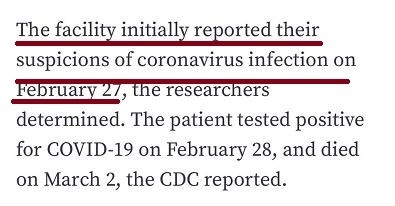 其首例患者2月19日出现症状,2月24日被送往医院,直到2月27日该机构才发出相关报告,并称只是怀疑该患者感染新冠肺炎。